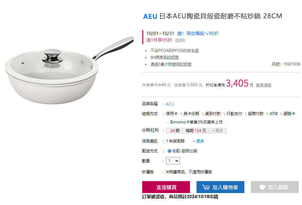 原價NT$2499的日本AEU貝殼瓷炒鍋(免費送28CM的鍋蓋!),現在成本價NT$1190送給大家!