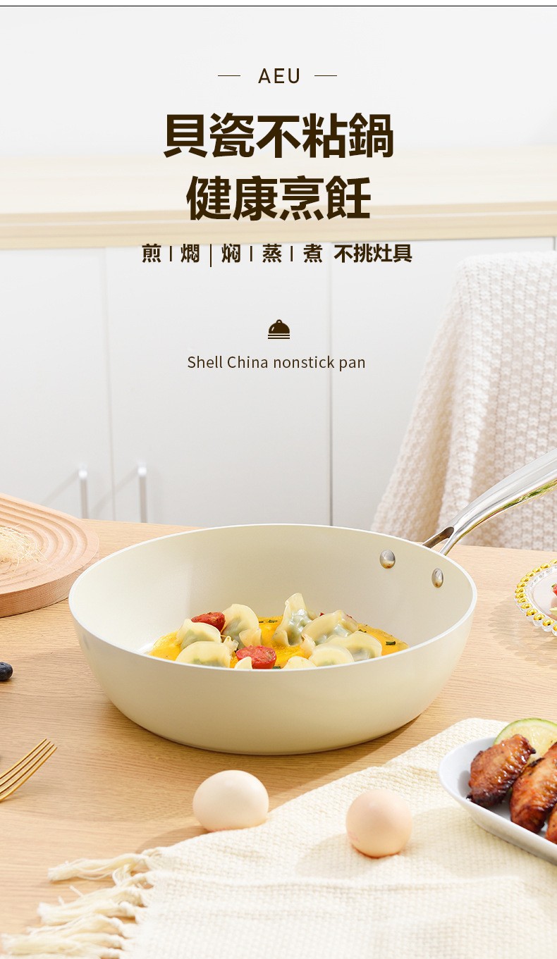 以“鎖住⻝物營養⾵味”為主題 同時加⼊“導熱速度快”“富含有益鐵質”“不粘超耐⽤”“無油煙”的元素 AEU貝殼瓷炒鍋在2013年⼀經推出,銷量就突破20萬個!售罄補貨是常態! 可⾒這款AEU貝殼瓷炒鍋廣受⼤家的熱愛!